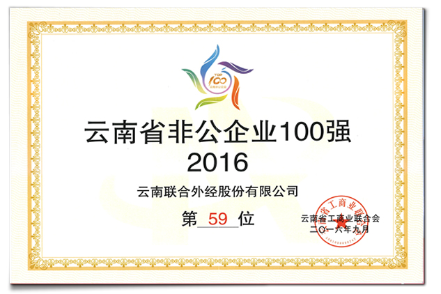 由云南省工商業(yè)聯(lián)合會(huì)和中國銀行云南省分行共同舉辦的“2016云南省非公企業(yè)100強(qiáng)發(fā)布會(huì)”,20日上午在昆明舉行,“2016云南省非公企業(yè)100強(qiáng)”榜單揭曉。云南聯(lián)合外經(jīng)有限公司再度入選100強(qiáng)企業(yè)。