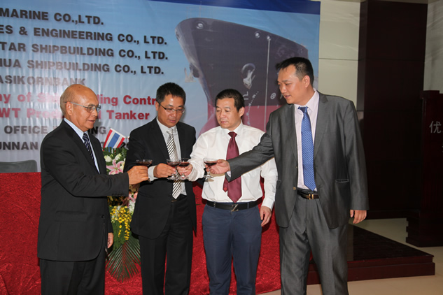 5月15日,在公司世博大廈會(huì)議室,隆重舉行了泰國(guó)3000噸油輪新造項(xiàng)目簽約儀式,參加項(xiàng)目的各方有泰國(guó)Nathalin集團(tuán),泰國(guó)PTT集團(tuán),泰國(guó)Kasicorn Bank,南京東嘉船廠(chǎng),南京永華船廠(chǎng)。此次建造的4條3000噸油輪是繼交付7000噸油輪,化學(xué)品船,3000噸油輪之后,我們與泰國(guó)客戶(hù)的又一次合作,充分表明客戶(hù)對(duì)我們的信任,及我們?cè)谔﹪?guó)船舶市場(chǎng)的堅(jiān)實(shí)基礎(chǔ)。據(jù)悉,在3000噸油輪之后,我們將繼續(xù)就5000噸成品油輪的合作進(jìn)行深入交流討論。