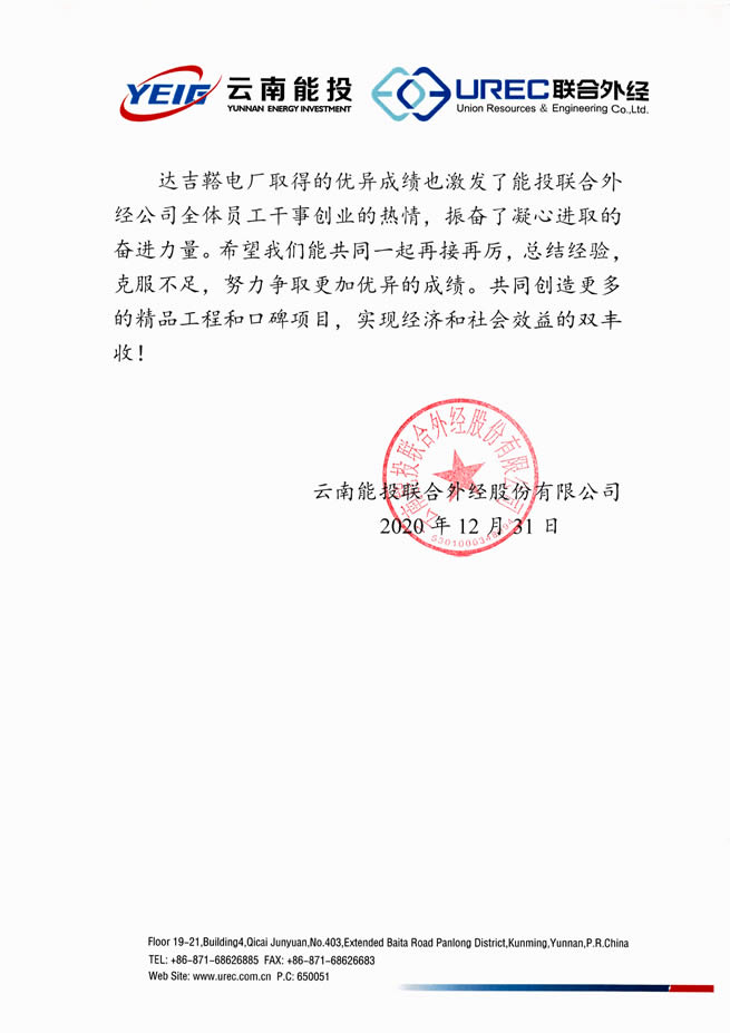 盡管今年有突發(fā)新冠疫情的不利影響,聯(lián)合能源達克鞳電力有限公司全體員工發(fā)揮了奉獻精神,堅守崗位,克服困難,創(chuàng)造了上網(wǎng)電量記錄,圓滿完成了2020年發(fā)電任務(wù)。能投聯(lián)合外經(jīng)總經(jīng)理馮柯向達克鞳項目公司表達了祝賀,并勉勵聯(lián)合外經(jīng)所有同仁2021年再創(chuàng)佳績!