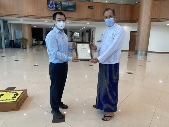 4月22日,明林羌液化天然氣發(fā)電項(xiàng)目向緬甸衛(wèi)生與體育部捐贈(zèng)呼吸機(jī)交接儀式在仰光國際機(jī)場舉行。中國駐緬甸使館經(jīng)商參贊譚書富、緬甸衛(wèi)生與體育部醫(yī)藥研究司司長佐丹吞、云南能投國際公司總經(jīng)理趙謹(jǐn)?shù)葏⒓印m?xiàng)目方向緬方捐贈(zèng)了5臺(tái)YH-830-11型雙水平正壓呼吸機(jī),佐丹吞司長代表緬甸衛(wèi)生與體育部接收物資并向公司頒發(fā)感謝證書。